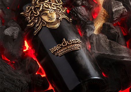 设计的核心是雕塑般的金属酒标,上面印着美杜莎摄人心魄的凝视。红酒款采用全浮雕金色铸造,白酒款则为全浮雕银色铸造,酒标从黑曜石般的瓶身升起,触感丰富,让人联想到历史的厚重与禁忌宝藏的诱惑。酒标表面细节丰