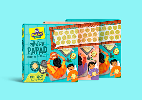 品牌标识围绕一幅连续的手绘插画展开,这幅插画环绕整个包装盒,描绘了母亲制作脆饼、孩子咬下第一口酥脆美味,以及生脆饼在南亚广泛使用的编织床(Chaarpai)上晾晒的场景。这款包装深深植根于记忆 ——