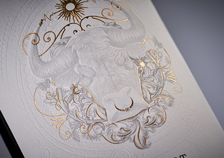 为了提升触觉和视觉体验,该标签采用了丰富的生产技术组合。雕塑般的3D浮雕为中心图标带来深度和体积,而精致的盲目浮雕则增加了微妙的纹理和细微差别。金箔烫印完成了设计,强调了关键的视觉口音,并加强了葡萄酒