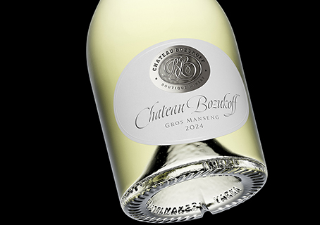 高端烫合式葡萄酒酒标设计,指将两种或两种以上不同材质烫合为一整枚酒标的工艺。以本案例为例,酒标由带纹理的纸张基底与可弯曲的金属标识组成:先将各材质组件分别印刷,并为其赋予专属的工艺装饰(如烫箔、压凸、