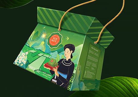 “Banh Chung Non Nuoc”的包装设计灵感来自曹邦的质朴和原始的自然美景,传达了自然与文化融合的壮丽土地的故事。包装忠实地再现了标志性的地标,如Mat Than山,Ban Gioc瀑布…
