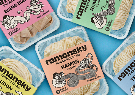 拉门斯基(Ramensky)是一家波兰鲜面生产商,产品主要供应亚洲餐厅及远东美食爱好者。为拓展零售业务版图,该公司委托我们为其焕新视觉形象,并设计拉面、乌冬面、油泼面及蘸面的产品包装。
