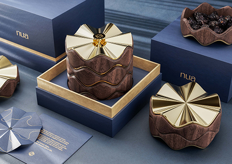 椰枣包装设计是一个模块化的、可堆叠的bonbonbonnière,带有圆形碗,以标志性的菱形几何叶子图案展示了椰枣树干,向这种非凡的水果及其强大的母树的起源致敬。