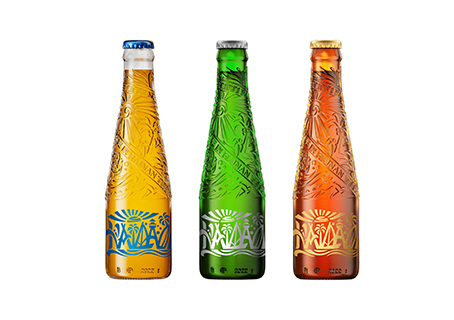 专为海南啤酒设计,充满海南风格的包装向用户展示了海南的自然风光和轻松的生活方式。包装巧妙地将太阳、椰子树、帆船等当地典型元素融入“海南”一词中,形成核心视觉符号。对于罐头包装,随着温度的降低,会出现用